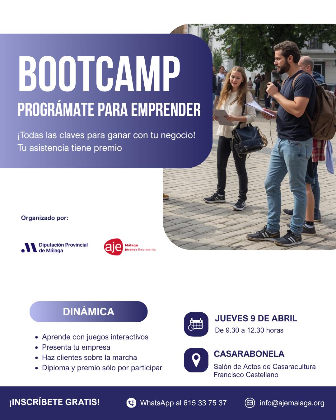 Desde el Ayuntamiento de Casarabonela informamos de que el Bootcamp “Prográmate para Emprender”, previsto para el próximo jueves 9 de abril, queda aplazado por falta de inscritos.